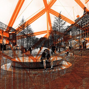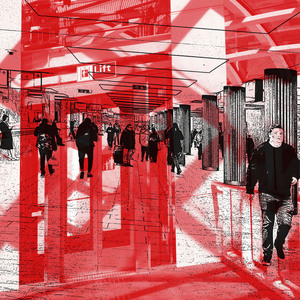 2025Location: Digitale collage van de Stationshal van Den Haag Centraal in het Rood.